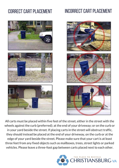 All town residents can receive curbside recycling. While garbage collection through the Town of Christiansburg is not mandatory for residents, those who have the service also receive curbside recycling. Solid waste collection includes both garbage and recycling services for a monthly fee of $22. When you sign up for solid waste collection, you do not have to receive the recycling cart if you do not want it, but you will have to pay the $22 monthly fee regardless of if you use the recycling cart. If you do not wish to have a recycling cart, please call Finance at 540-382-9519, or you may cancel your solid waste collection services.